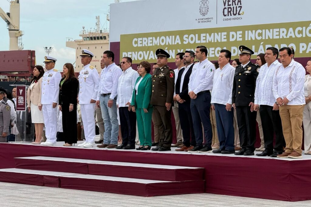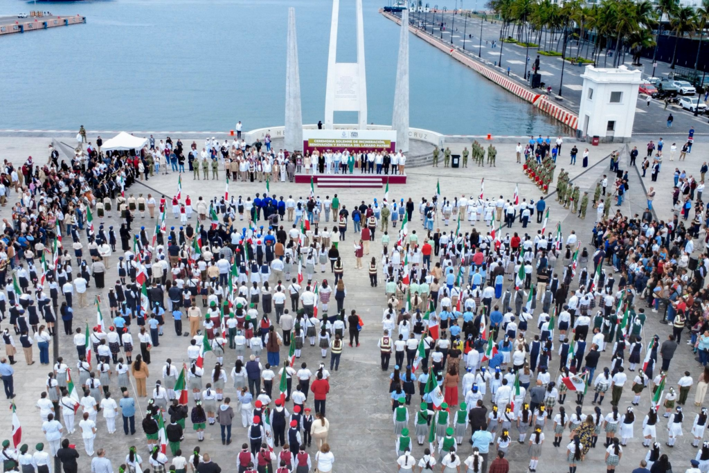 Acompañada de autoridades federales, estatales, municipales, navales, militares y Guardia Nacional, participó en la incineración simbólica del lábaro patrio, procedimiento realizado conforme al artículo 54 Bis de la Ley sobre el Escudo, la Bandera y el Himno Nacional.