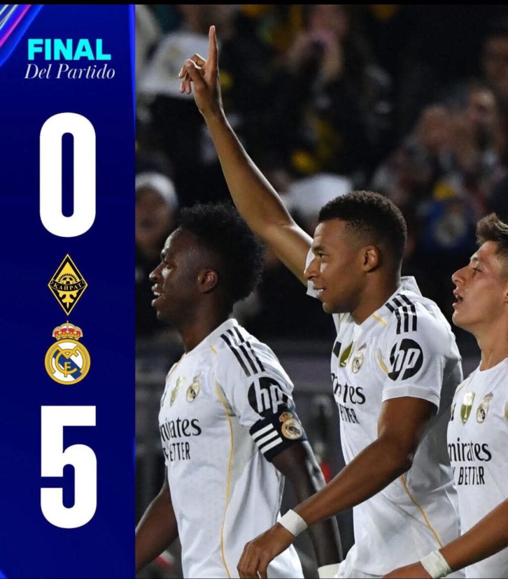 Almaty, Kazajistán.- El Real Madrid demostró su jerarquía en la UEFA Champions League al golear 5-0 al Kairat Almaty en el Central Stadium de Almaty, en un encuentro correspondiente a la segunda jornada de la fase de liga. Con una actuación estelar de Kylian Mbappé, quien anotó un hat-trick, los dirigidos por Xabi Alonso sumaron su segunda victoria consecutiva en el torneo, consolidándose como uno de los favoritos para avanzar en la competición.