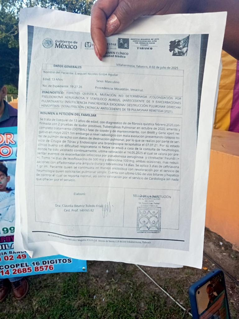 “Nos dijeron que él solo iba a vivir 3 años, pero gracias a Dios lleva 13 años con nosotros. Hoy su vida depende de un medicamento muy costoso llamado Trikafta y cada caja del medicamento tiene un costo de más de 200 mil pesos mensuales y es vital para poder mantener con vida al pequeño Ezequiel.