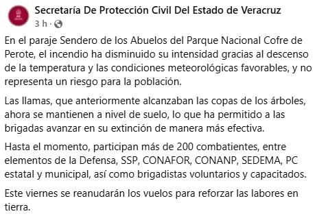 Xalapa, Ver.— Las labores para controlar el incendio forestal en el Parque Nacional Cofre de Perote registraron avances significativos, informó este jueves la gobernadora de Veracruz, Rocío Nahle, al compartir el más reciente comunicado emitido por la Secretaría de Protección Civil.
