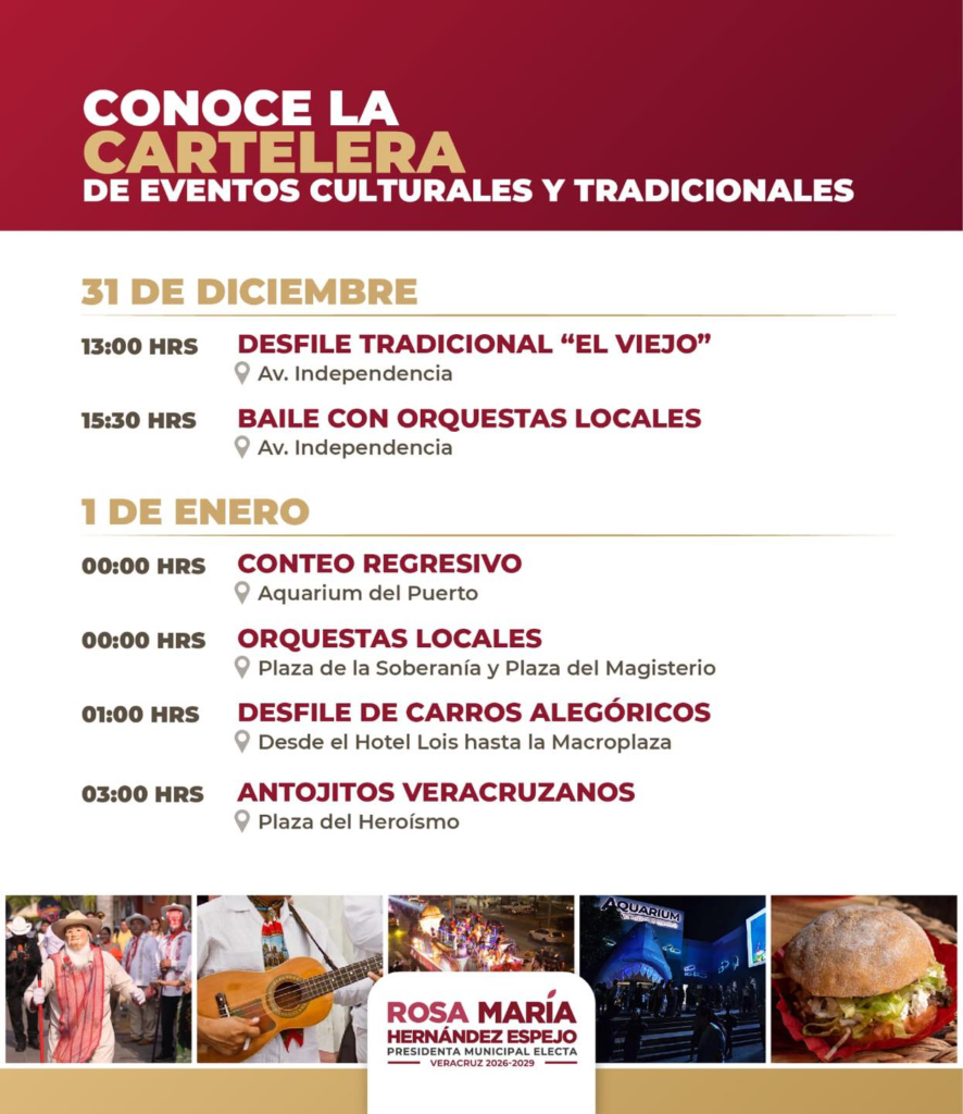 La alcaldesa electa de Veracruz, Rosa María Hernández Espejo, por medio de sus redes sociales ha dado a conocer la cartelera de eventos culturales y tradicionales para el día 31 de diciembre, despidiendo el 2025 y para el día 1 de enero, dando la bienvenida al 2026.