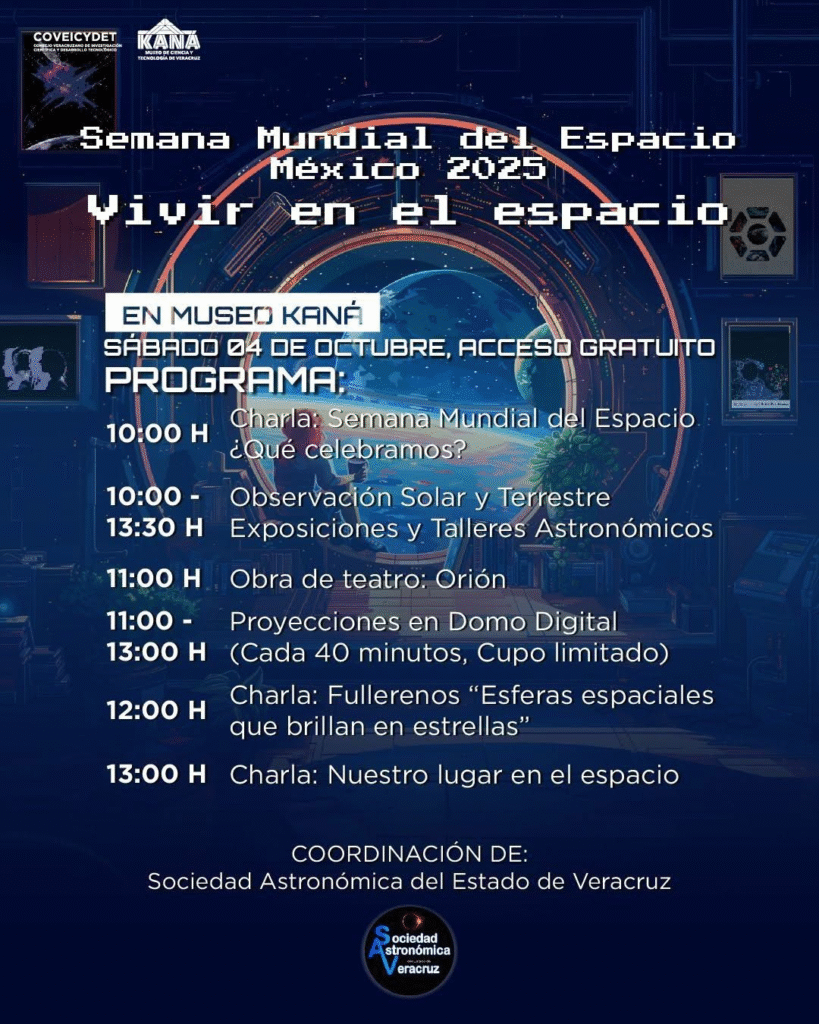 Irineo Pérez Melo.- Con el respaldo de la Sociedad Astronómica del Estado de Veracruz (SAEV), el Consejo Veracruzano de Investigación Científica y Desarrollo Tecnológico (COVEICYDET), celebrará en Xalapa la Semana Mundial del Espacio 2025 “Vivir en el Espacio”, a realizarse del 4 al 10 de octubre.