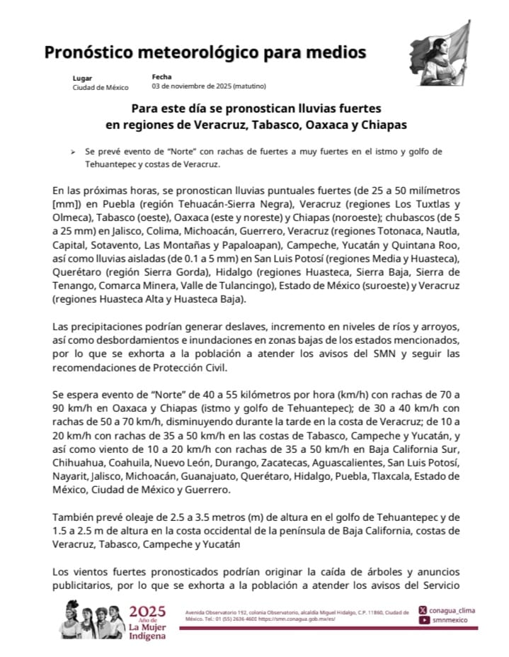 Se pronostican lluvias fuertes en regiones de Los Tuxtlas y Olmeca