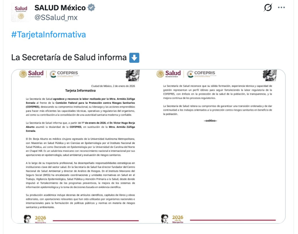 Salud Secretaría de Salud informa del relevo en COFEPRIS Redacción enero 2, 2026 1 min read Compartir: La presidenta Claudia Sheinbaum dio a conocer que la decisión de designar a Víctor Hugo Borja Aburto como Titular de la COFEPRIS en sustitución a Zúñiga Estrada, fue del titular de la Secretaría de Salud, David Kershenobich. Compartir: Post navigation Previous Con gran afluencia de los contribuyentes, inicia Ayuntamiento de Veracruz cobro del impuesto predial 2026Next Gobierno de Poza Rica da banderazo de salida a nueva etapa de Limpia Pública Deja un comentario Cancelar respuestaTu dirección de correo electrónico no será publicada. Los campos obligatorios están marcados con *Comentario * Nombre * Correo electrónico * Web Guardar mi nombre, correo electrónico y sitio web en este navegador para la próxima vez que haga un comentario. Historias similares 3 min read Destacadas Nacional Salud Supera ISSSTE meta de cirugías y consultas realizadas en 2025: Martí Batres enero 13, 2026 Redacción 2 min read Principal Salud Nuevo centro de alta especialidad busca acelerar diagnósticos y desahogar institutos nacionales de salud: Kershenobich enero 13, 2026 Redacción 1 min read Salud Anuncia ISSSTE Calendario de Pagos 2026 a personas pensionadas y jubiladas enero 9, 2026 Redacción