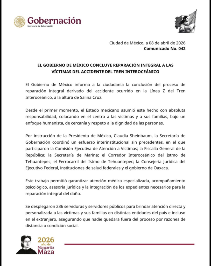 La Secretaría de Gobernación(SEGOB) dio a conocer mediante un COMUNICADO que el Gobierno de México concluyó el proceso de reparación integral del daño tras el accidente en la Línea Z del Tren Interoceánico, ocurrido en Salina Cruz.