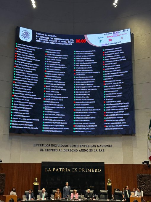 Con 81 votos a favor y 30 en contra (del PRI y el PAN), el pleno del Senado de la República ratifica a Roberto Velasco como nuevo titular de la Secretaría de Relaciones Exteriores