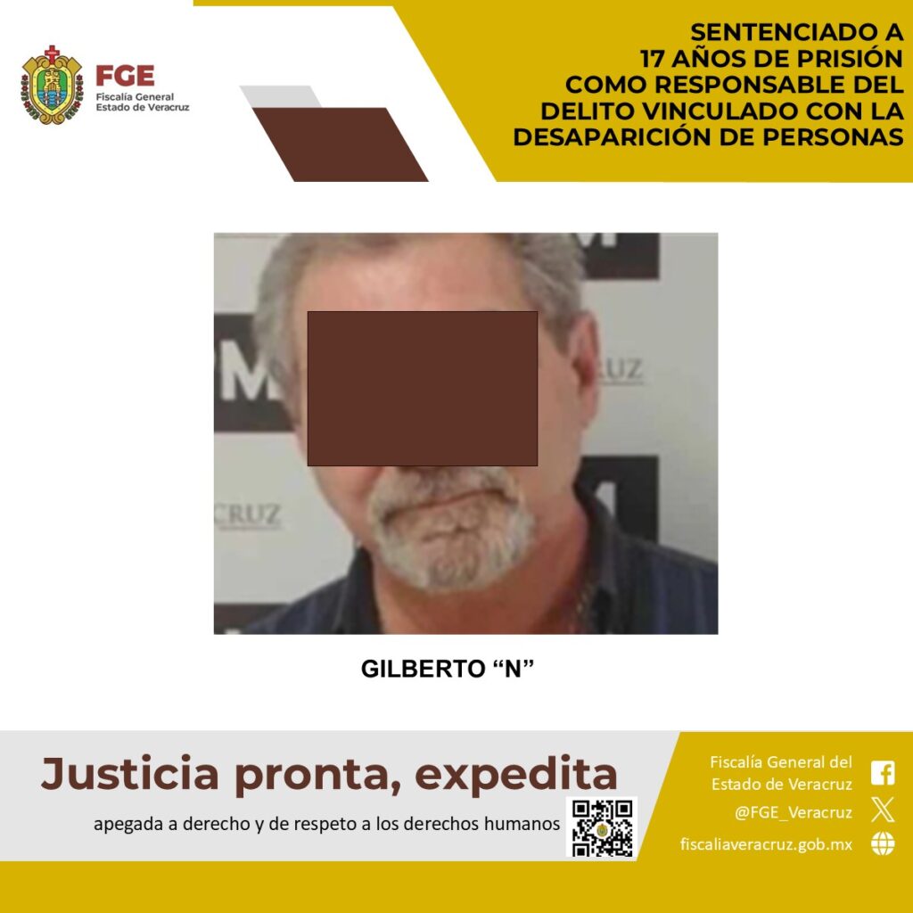 Xalapa, Ver., 8 de abril 2026.- Como resultado de una investigación ministerial sólida y el desahogo de pruebas en el juicio, la Fiscalía General del Estado de Veracruz, logró la sentencia condenatoria de Gilberto “N”, consistente en 17 años de prisión, declarado por el órgano jurisdiccional como responsable del delito vinculado con la desaparición de personas.