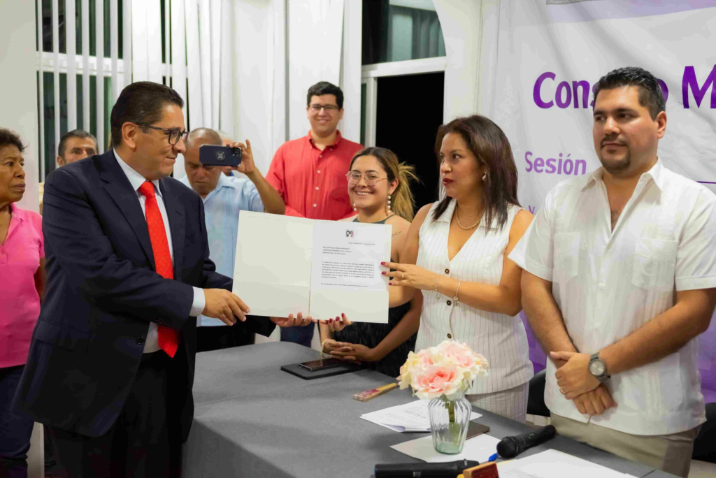 Silvio Lagos Galindo entregó la documentación correspondiente a Ana Paola Román Hernández, presidenta del Consejo Municipal del Organismo Electoral, como candidato a la presidencia municipal, le acompaña como candidata a la sindicatura, Yolanda Rendón Hernández.