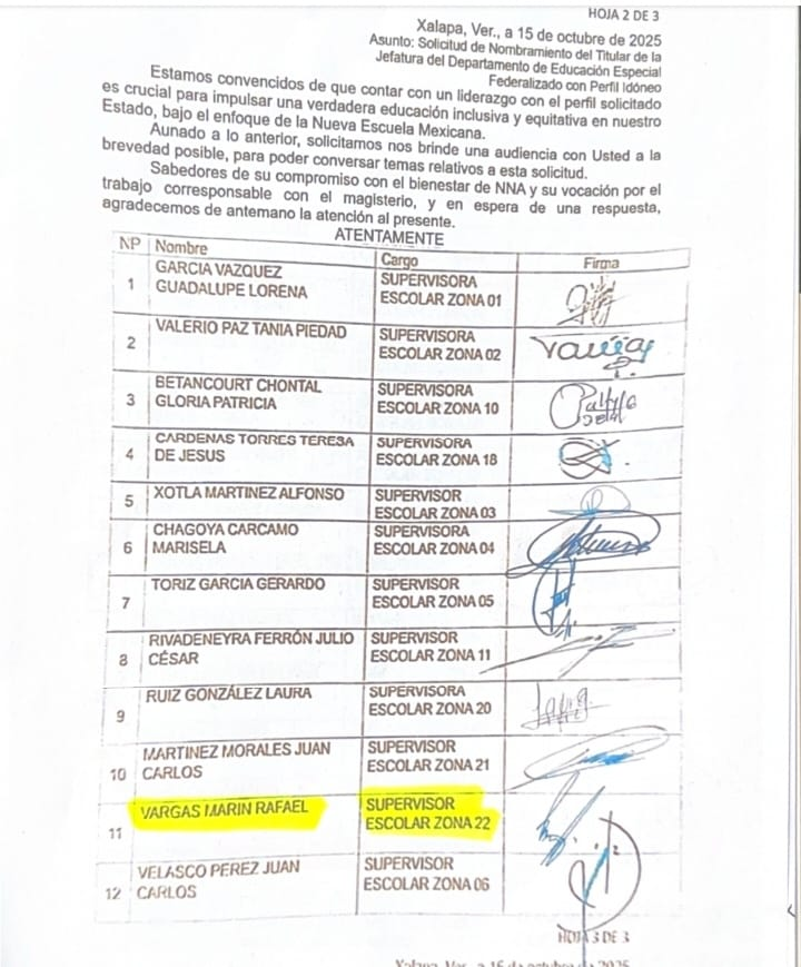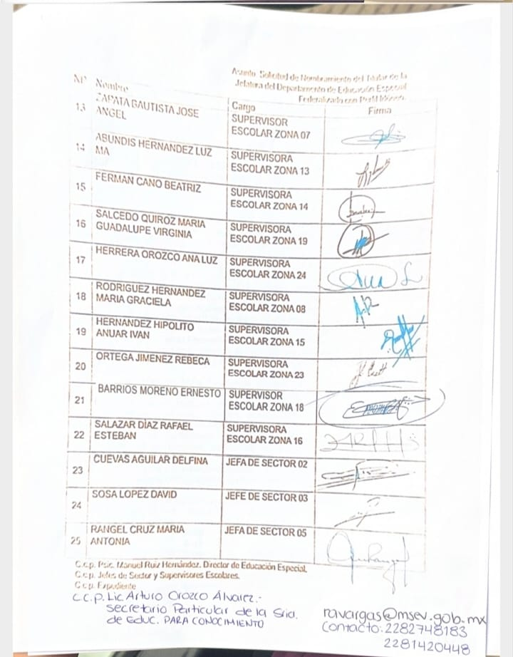 En un escrito, fechado el pasado 15 de octubre del año en curso, dirigido a la secretaria de Educación de Veracruz (SEV), Claudia Tello Espinoza, signado por los 22 supervisores y 3 jefes de sector de esta modalidad educativa, en el que solicitan el nombramiento del titular de la Jefatura del Departamento de Educación Especial Federalizado con Perfil Idóneo, debido a que el anterior, al no cumplir con este requisito fue destituido.