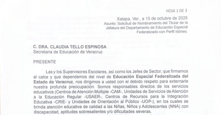 “Desde el pasado 15 de septiembre del año en curso, fecha en que se nos notificó la renuncia del titular, carecemos de Jefa o jefe de Departamento de Educación Especial Federalizada en Veracruz. La prolongación de esta situación, lejos de ser un tema meramente administrativo, impacta directamente en la garantía del derecho a la educación y la atención integral de nuestra población estudiantil”, refiere el documento.
