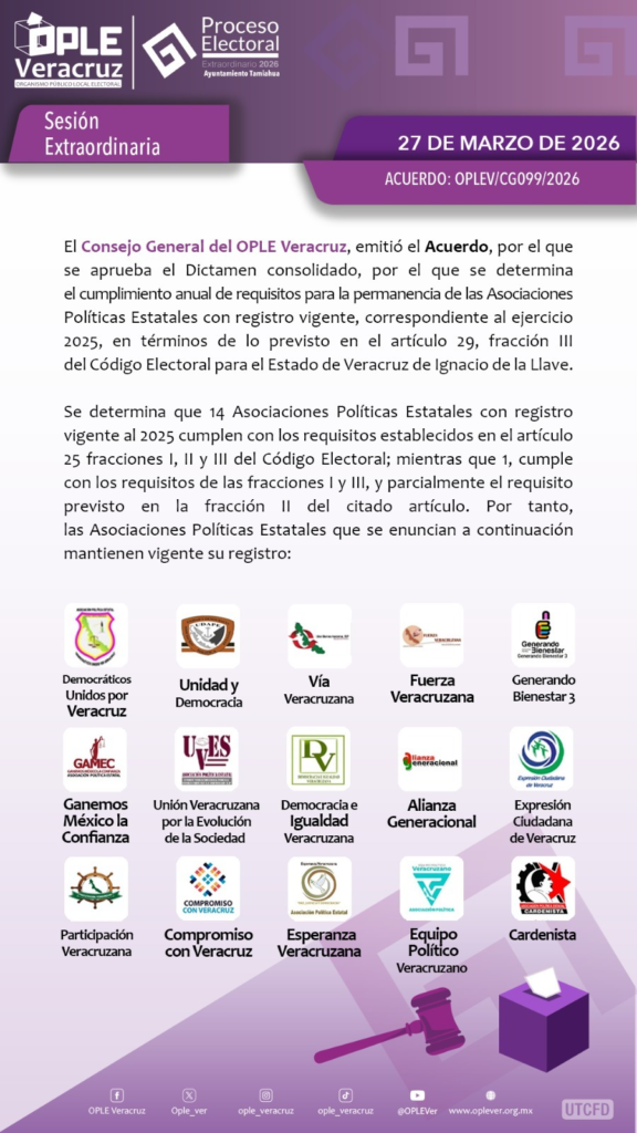 En otro punto del orden del día, se aprobó el dictamen consolidado, por el que se determina el cumplimiento anual de requisitos para la permanencia de las Asociaciones Políticas Estatales con registro vigente, correspondiente al ejercicio 2025, en términos de lo previsto en el artículo 29, fracción III del Código Electoral para el Estado de Veracruz de Ignacio de la Llave.