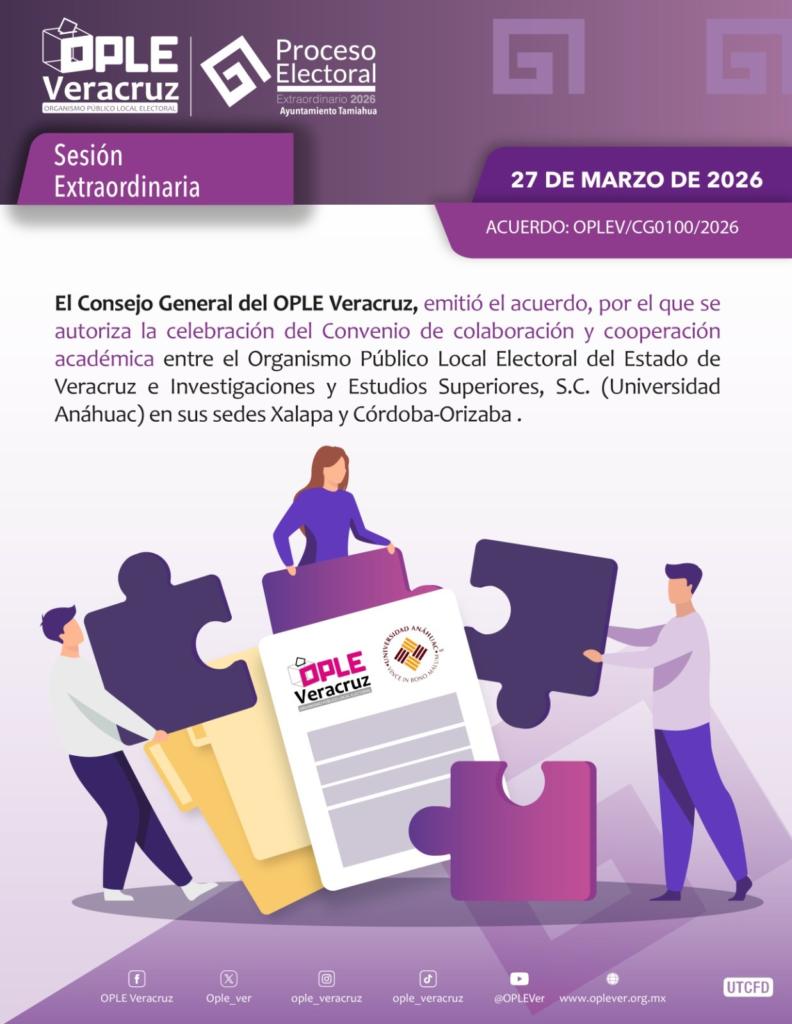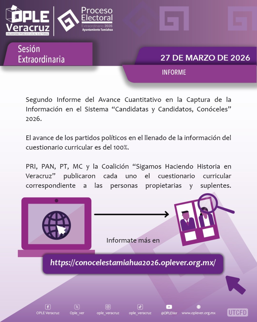 Xalapa, Ver., 27 de marzo 2026.- En sesión extraordinaria del Consejo General del Organismo Público Local Electoral del Estado de Veracruz (OPLE Veracruz), se presentó que segundo informe del avance cuantitativo en la captura de la información en el Sistema “Candidatas y Candidatos, Conóceles” 2026, para el Proceso Electoral Local Extraordinario 2026 (PELE 2026) del ayuntamiento del municipio de Tamiahua.