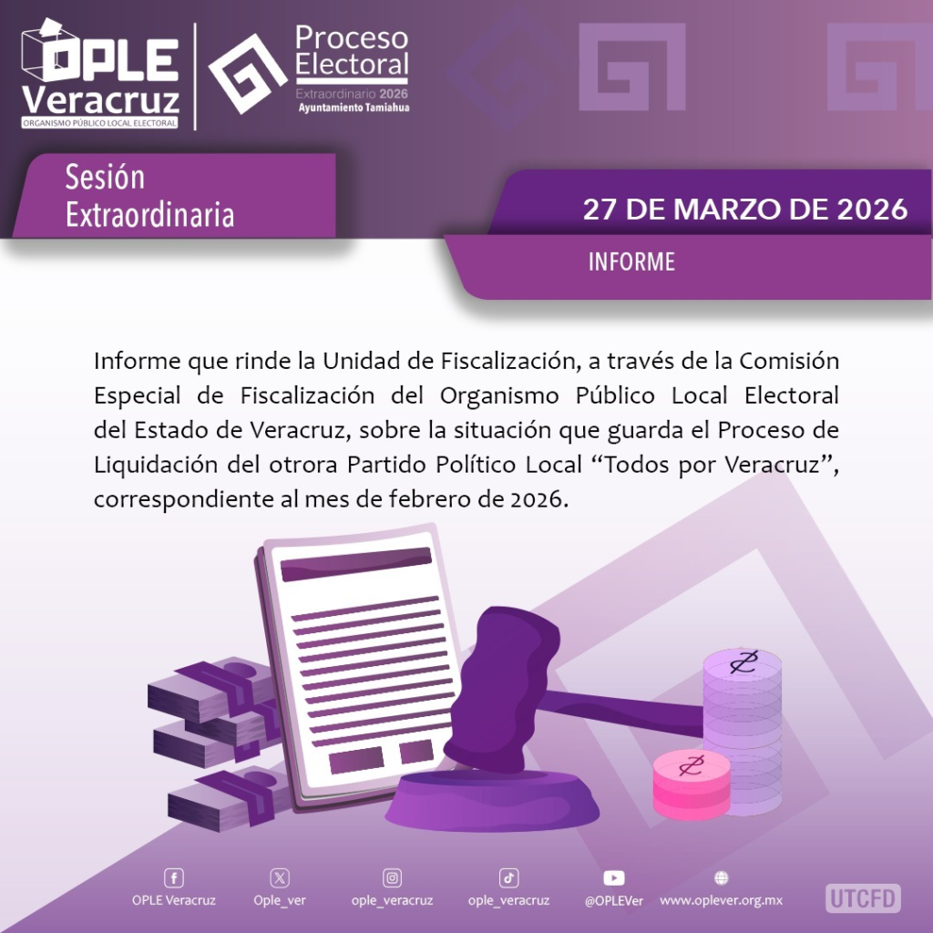 Durante la sesión extraordinaria, se presentó el informe sobre la situación que guarda el Proceso de Liquidación del otrora Partido Político Local “Todos por Veracruz”, correspondiente al mes de febrero de 2026.