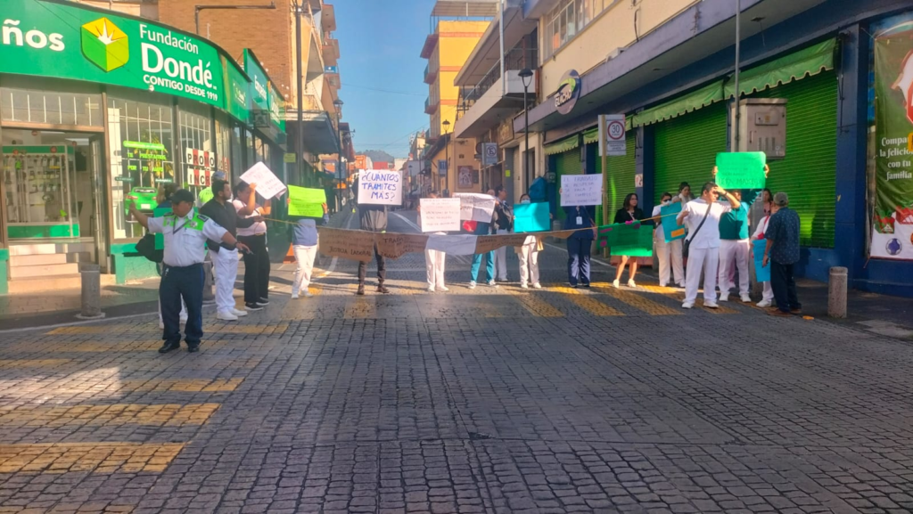 Irineo Pérez Melo.- Trabajadores del sistema estatal de Salud, adscritos al IMSS Bienestar se manifestaron pacíficamente en el centro de la ciudad de Xalapa y bloquearon la esquina que conforman las calles Primo Verdad y Zaragoza por espacio de dos horas, al no ser atendidos al filo de las 11:00 horas, realizaron esta misma acción en la Avenida Juan de la Luz Enríquez, frente a Palacio de Gobierno, para exigir el pago del bono navideño, que les fue prometido hacerlo a más tardar el pasado viernes, sin que a la fecha se haya ejecutado.
