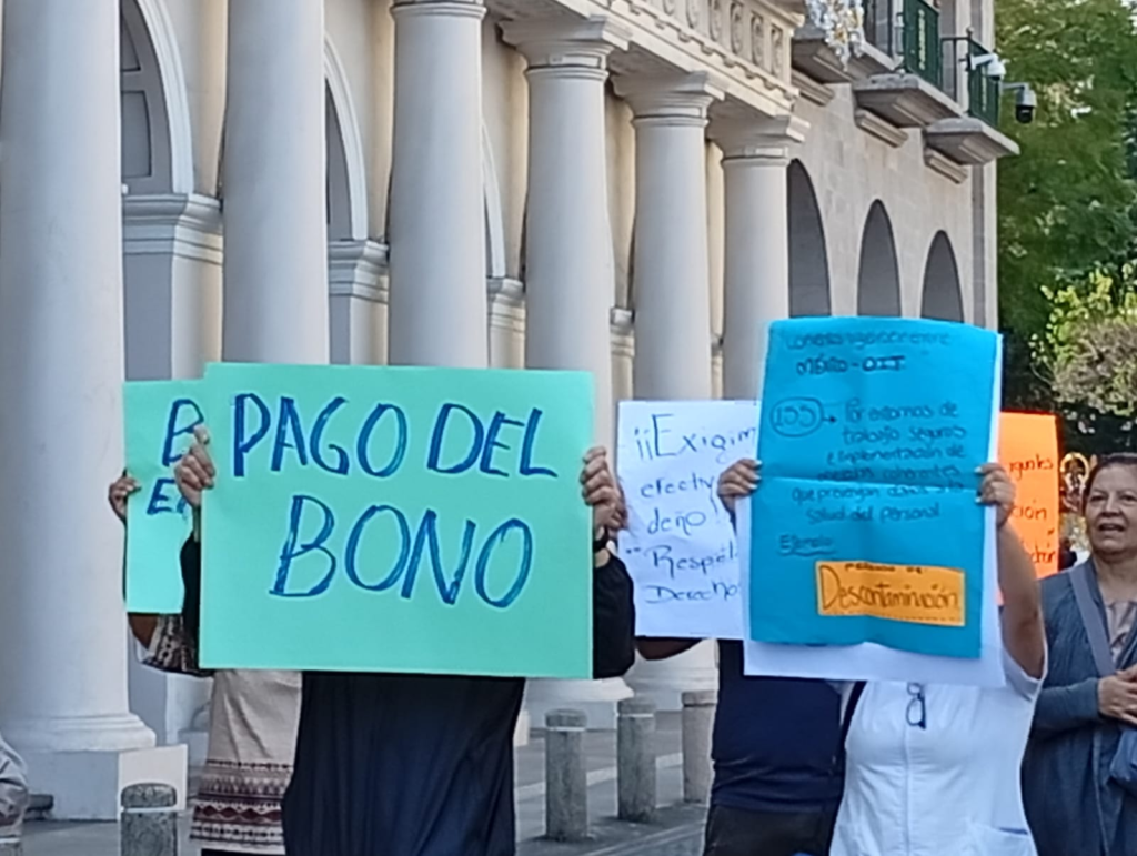 • Exigen pago del bono navideño, que se les pretende cubrir hasta enero próximo, así como se les otorgue el periodo de descontaminación y la dotación de uniformes medicos.