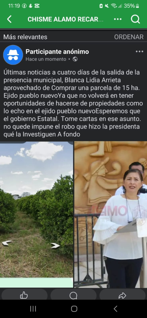 En Álamo Temapache circula la versión de que la alcaldesa Blanca Lilia Arrieta Pardo, ha comprado una parcela en el ejido Pueblo Nuevo, con el consentimiento y apoyo de las actuales autoridades ejidales.