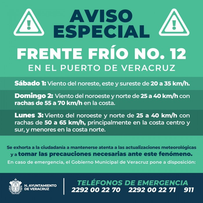 Las autoridades municipales de Veracruz Ciudad y Puerto, han emitido Aviso especial por entrada del frente Frío número 12.