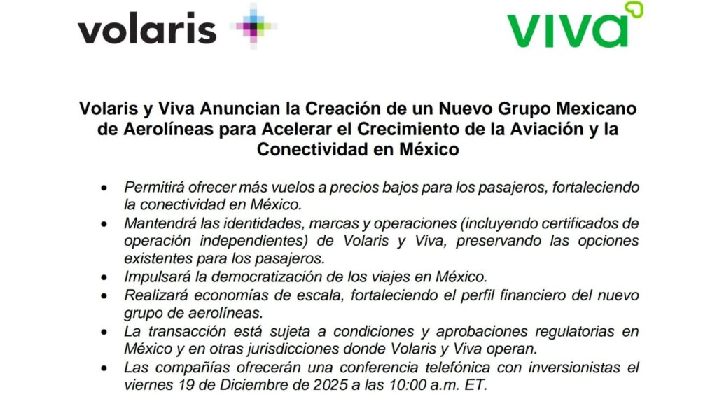 Como parte del proceso de comunicación con el mercado, Volaris y Viva informaron que ofrecerán una conferencia telefónica con inversionistas el viernes 19 de diciembre de 2025, a las 10:00 horas (tiempo del Este), para detallar el alcance y las implicaciones del acuerdo.