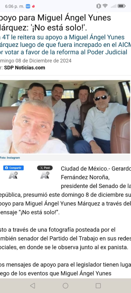 Gerardo Fernández Noroña, presidente del senado, publicó una fotografía en donde se aprecia que en un vehículo…(¡qué vehículo!) se trasladan varios senadores, entre ellos Adán Augusto López, presidente de la JUCOPO y Miguel Ángel Yunes Márquez, el veracruzano conocido como “el voto 86” y que no hace poco tiempo vociferaba en contra de AMLO y la 4T.